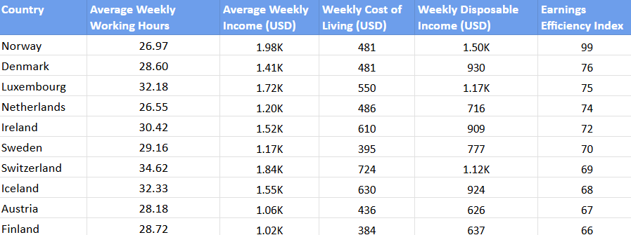 The research examined countries using four main metrics: average weekly working hours, average weekly income, weekly cost of living, and weekly disposable income. Countries were ranked using an Earnings Efficiency Index that measured working hours against take-home pay after living costs, with higher scores indicating better income relative to work effort.