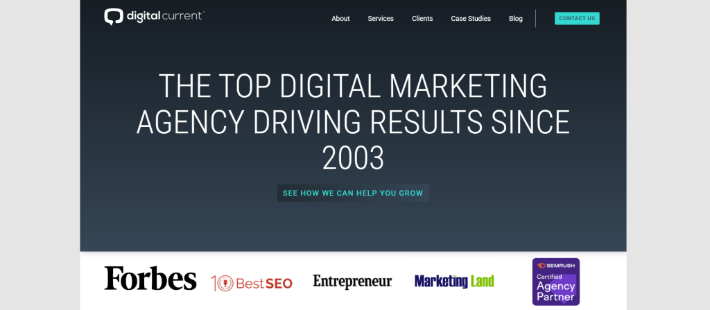 Digital Current offers insights into client journeys on their website, showcasing just how effective their solutions are. They have also won multiple awards over the years (such as from SemRush and Clutch) due to their high-quality services.