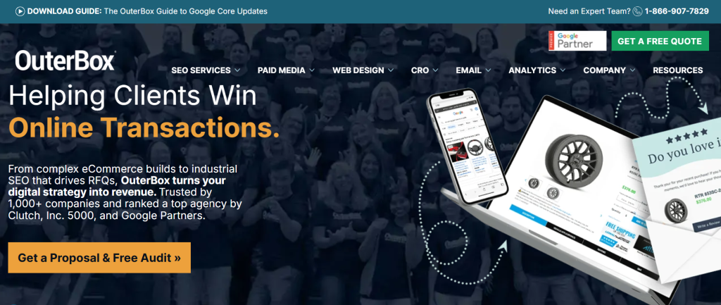 Regularly recognised by Forbes and Neil Patel, OuterBox is an all-in-one e‑commerce SEO provider. They offer full-service solutions for Shopify, Magento, and other leading platforms, making them ideal for businesses of all sizes.