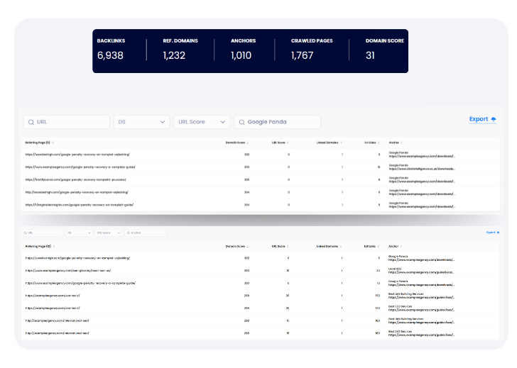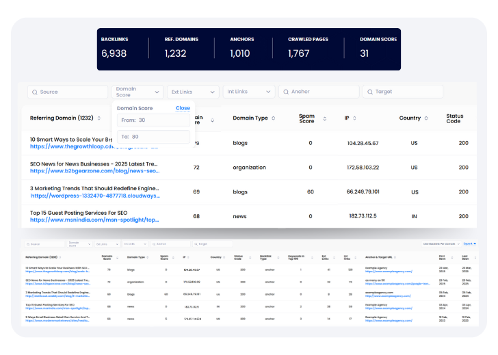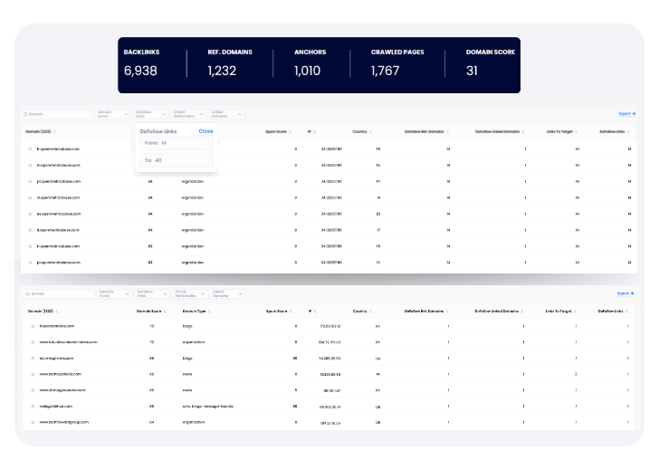 Leverage our powerful backlink analysis tool to gain deep insights into your backlink profile and close the gap with your competitors. Our tool features a proprietary metric—Domain Score (DS)—alongside a cutting-edge dataset that includes: backlinks, referring domains, best links by page, broken backlinks, anchor text. link types, domain TLD’s, platform type and attributes to name a few..