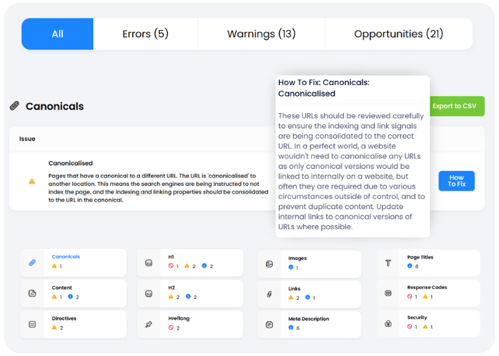 Our website SEO audit tool covers key critical metrics, providing a clear list of errors and actionable fixes to drive meaningful improvements