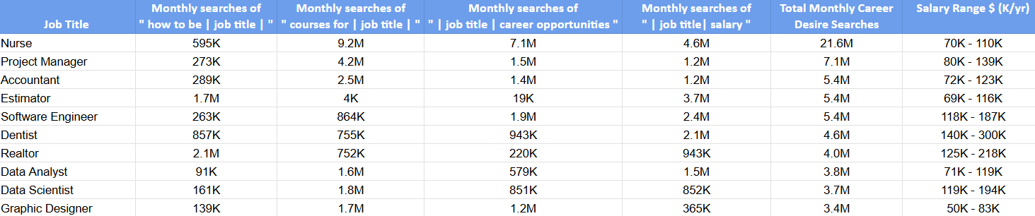 “Realtors” come in seventh for the most desired job title in 2025, with the highest interest in how to enter the field. Over 2M searches focused on how to become a realtor, 300K more than any other title in the ranking. Realtors are also among the best paid at $171K.