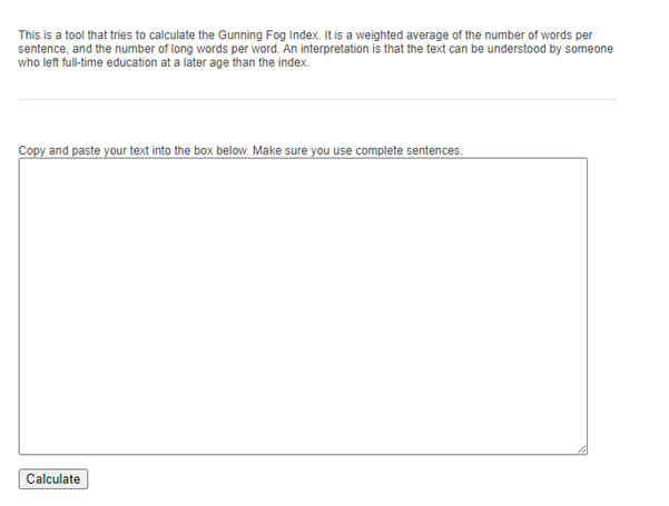 The Gunning Fog Index Calculator is a basic readability tool that allows you to copy and paste your content into a box provided to learn the reading grade level of your piece.