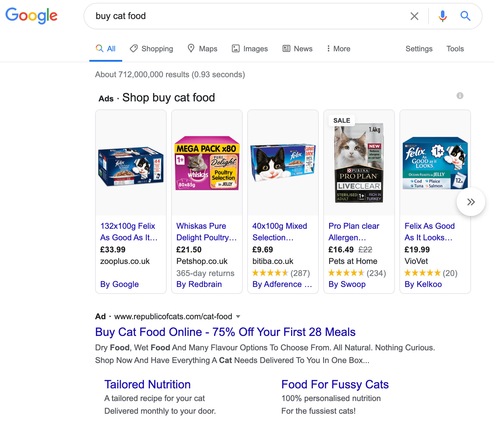 For example, if they search ‘buy cat food’ and you sell this product, then it’s worth targeting that search query. However, if they search ‘premium Smalls cat food’ or include any other brand in their transactional query, then it means they’re looking for a specific brand from a specific provider and might not be interested in your product. It may be worth running a promotional advert on that SERP, but it’s definitely not worth targeting.