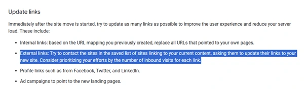 That said, the Google Search Central Document states that: “External links: Try to contact the sites in the saved list of sites linking to your current content, asking them to update their links to your new site. Consider prioritising your efforts by the number of inbound visits for each link.”