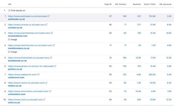 When planning a URL restructure, carefully review which search terms drive the most traffic and enquiries. Take “used cars for sale” as an example, a highly competitive keywordKeywords are the words and phrases that potential customers might search for to find your business. with an average UK monthly search volume of 49,500.