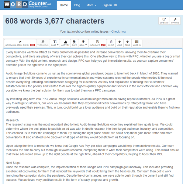 Here at Click Intelligence, we are in the process of creating our very own word counter that is deigned to be used alongside our content marketing services so that you can enjoy maximum visibility online and soar ahead of your competitors on SERPs.